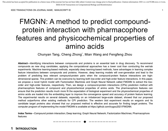 近日,我院教师唐春艳工程师、钟诚教授、广西大学生命科学与技术学院王勉副教授、吉林大学计算机学院周丰丰教授的研究论文“FMGNN: A method to predict compound protein interaction with pharmacophore features and physicochemical properties of amino acids”IEEE/ACM Transactions on Computational Biology and Bioinformatics期刊录用,且已经在线发表(DOI: 10.1109/TCBB.2022.3172340)。IEEE/ACM Transactions on Computational Biology and Bioinformatics是中国计算机学会CCF推荐的综合交叉学科生物信息计算领域顶级期刊。