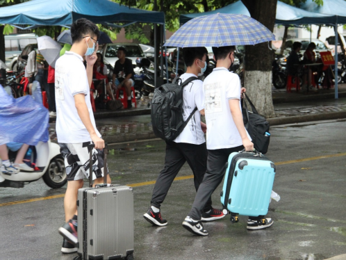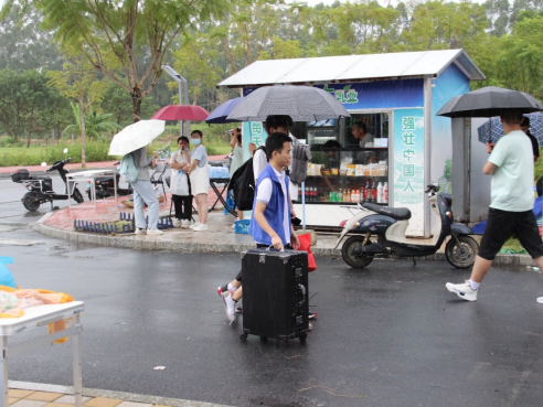 迎新志愿者冒雨接待新同学