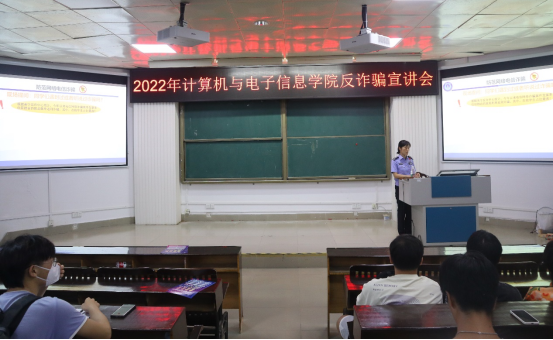 为提高新生安全防范意识,杜绝被诈骗事件的发生,2022年9月23日晚上,在学院214报告厅,计算机与电子信息学院组织举行反诈骗宣讲会。学院辅导员庞承业老师、南宁市公安局西乡塘分局反诈中心杨俭警官以及学院2022级全体新生参加会议。