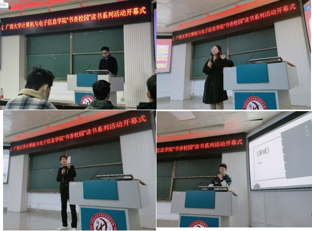 为进一步丰富校园文化生活,努力营造积极向上、健康文明的校园文化氛围,引导学生博览群书,开阔学生视野,增长知识,陶冶情操,计算机与电子信息学院“书香校园”读书系列活动于2022年12月2日晚上在学院214报告厅正式开幕。学院辅导员李易明老师、各班级同学、读书分享嘉宾参与本次活动。
