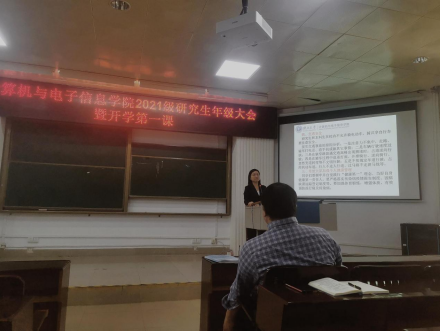 2023年3月10日,计算机与电子信息学院2021级研究生年级大会暨开学第一课在学院214报告厅举行。学院党委书记钟诚教授、学院党委副书记邓珍琪老师、学院研究生秘书胡亮青老师、辅导员及兼职辅导员参会。会议由学院团委副书记、辅导员杨洋老师主持。