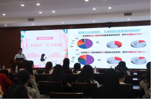 然后,广西医科大学附属肿瘤医院乳腺外科姬逸男副主任为大家做了《重塑“乳”初 逐梦未来——关于乳腺癌治疗的那些事儿》的主题报告。她在报告中指出,现在女性乳腺癌发病率相当高,女性应该做好定期检查。同时,姬副主任通过数据和图片对比,向大家展示了乳腺切除术后的效果,并介绍了乳房再造术的应用和治疗范围,以及进行肿瘤治疗后的复查和随访措施。