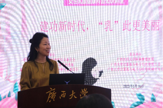 会议伊始,计算机与电子信息学院杨丽娜副教授致辞。她对本次公益活动举办的背景和意义、对计算机与电子信息学院工会发展历史分别做了介绍,也对本次公益活动的专家团队表示感谢。她强调,为提高师生对乳腺疾病的认知,此次活动特别邀请了广西医科大学附属肿瘤医院的乳腺外科专家团队进行宣讲,旨在增强师生的自我保健意识和正确的生活习惯,以健康的体魄融入到学习、工作和生活中。