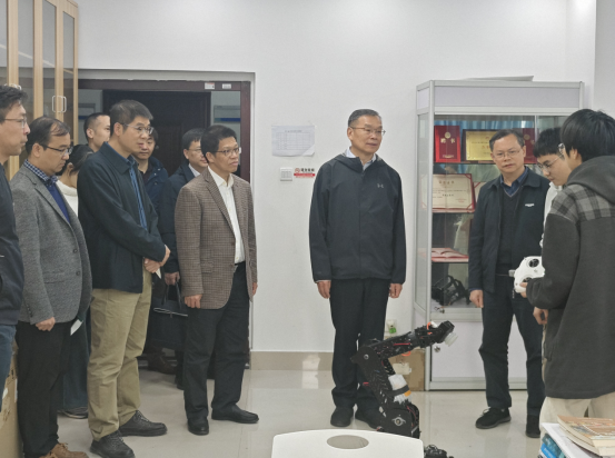 接着,韩林海校长到我院305无人机与机器人图形像与虚拟现实技术物联网技术实验室、中国-柬埔寨智能制造技术联合实验室看望留校师生。韩校长观摩了学生团队正在调试测试的robomaster机甲大师比赛项目——六轴机械臂机器人,该项目是由我院学生与机械工程学院学生联合自主设计研发,主要用于物品的抓取和存放,后续学生团队将加装工业相机用于机械臂自主路径抓取,更新迭代达到能使用激光雷达进行定位导航并自主存放物品。