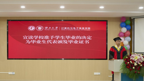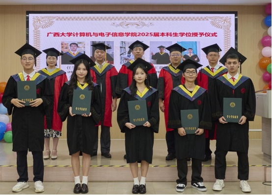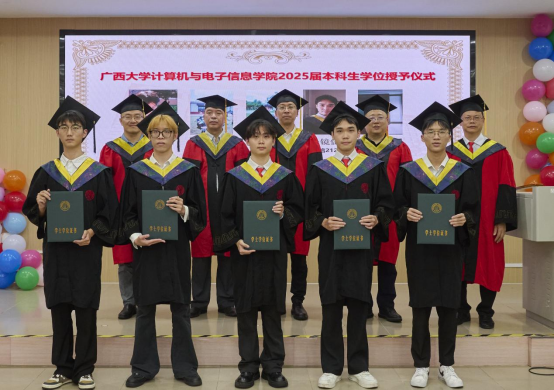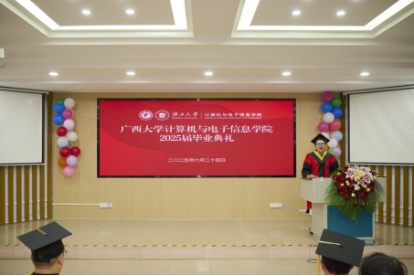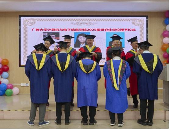 最后,全体师生共同奏唱校歌,在激昂的旋律中,广西大学计算机与电子信息学院2025届毕业典礼暨学位授予仪式正式落下帷幕。