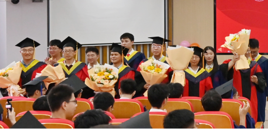 在学生代表为导师献花的温馨场景中,师生情谊在芬芳与掌声中得以传递,现场洋溢着深厚的感动与祝福。