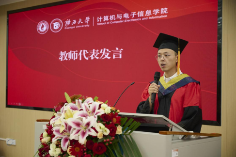 王雪峰老师作为教师代表发言,他以“以华为精神照亮青春征程”为题,勉励毕业生们永葆艰苦奋斗的精神、持续创新的意识以及团队协作的力量,在顺境时保持清醒、在逆境时坚守信念、在平凡中追求卓越。