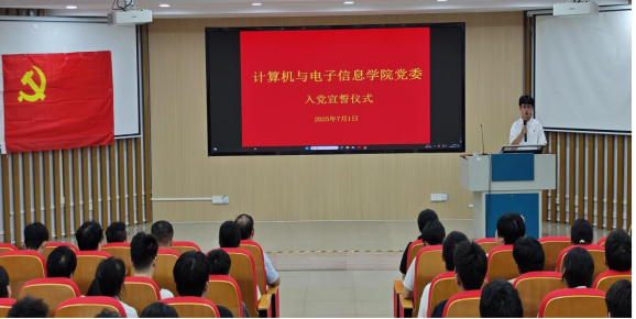 2025年7月1日下午,计算机与电子信息学院党委在学院214报告厅举行了庄严的入党宣誓仪式。学院党委书记赵进创同志、副书记夏士岚同志以及梁舒琦等118名新发展党员参加本次入党宣誓仪式。学院党建工作委员会党建部部长陈聪同志主持本次仪式。
