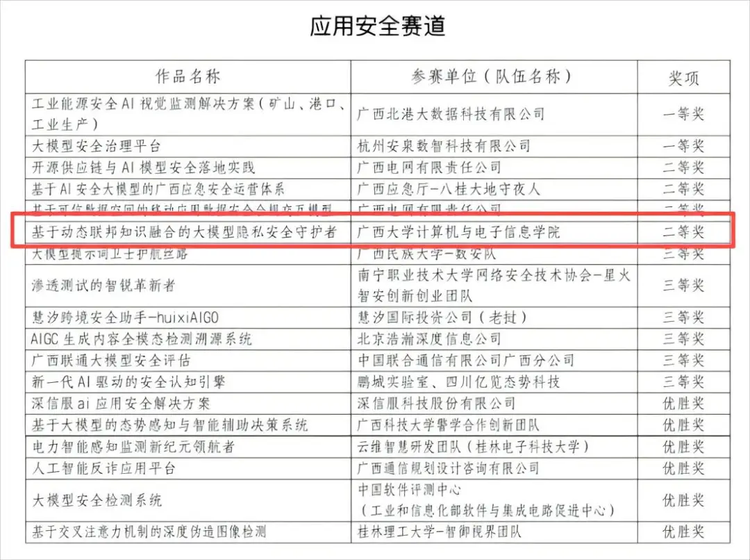 近日,由广西壮族自治区党委网信办、广西壮族自治区大数据发展局、南宁市人民政府联合主办的首届中国—东盟“护航丝路”人工智能安全大赛在南宁圆满落幕。我院代表队凭借"基于动态联邦知识融合的大模型隐私安全守护者"项目,在应用安全赛道中脱颖而出,荣获二等奖。