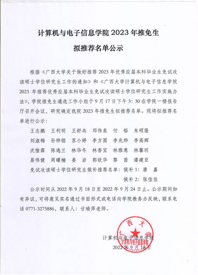 计算机与电子信息学院2023年推免生拟推荐名单公示
