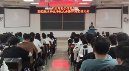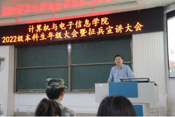 2022年3月15日下午,计算机与电子信息学院在214报告厅,组织召开2022级本科生年级大会暨征兵宣讲大会。学院党委副书记邓珍琪老师、校武装部陈榕平老师、学院辅导员庞承业老师和李易明老师、学院教学秘书甘瑜萍老师和罗程老师、电信233班班主任常侃老师以及学院2022级全体本科生参加会议。