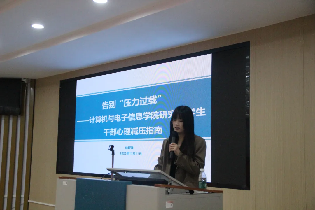 2025年11月11日上午,计算机与电子信息学院研究生会在学院214报告厅成功举办了 “学生干部训练营”第四期——心理团辅培训。本次活动旨在帮助学生干部掌握心理调适技巧,有效缓解日常学习与工作中的压力。活动特邀学校学生发展指导中心姚璎珊老师担任主讲嘉宾,培训由我院研究生会成员阮梅琳同学主持。